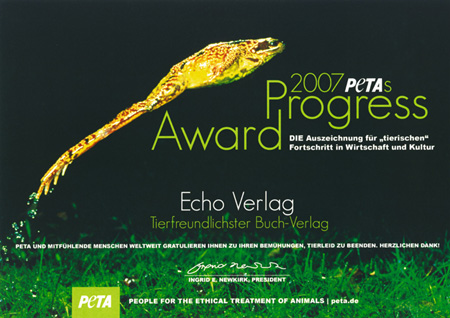 ...powered by freaks-at-work | Der Echo Verlag freut sich über die Verleihung des Progress Award 2007 durch PETA in der Kategorie Tierfreundlichster Buch-Verlag. PETA schreibt: "Indem der Echo Verlag mit Standardwerken der Tierrechtsbefreiung auf Tierschutzthemen aufmerksam macht, tragen Sie zu einem ethischeren Lebensstil in unserer Gesellschaft bei. Wir gratulieren Ihnen zu Ihrem innovativen und fortschrittlichen Beitrag zum Tierschutz und zeichnen Sie für Ihre Voraussicht und Initiative, Ihr Bewusstsein, Ihre Kreativität und Freundlichkeit aus." PETAs Progress Awards werden jedes Jahr für hervorragende tierfreundliche Leistungen in Kultur und Wirtschaft verliehen. |